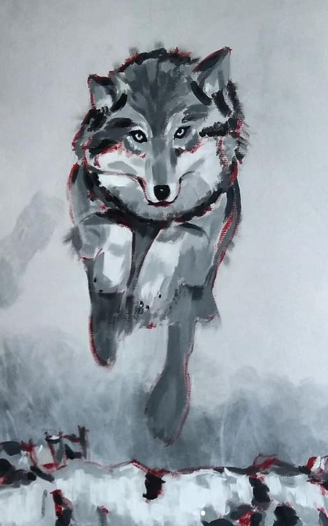 Algunos trazos en rojo marcan sutilmente los contornos de su cuerpo, acentuando la energía del salto y guiando la mirada a través de la composición. La nieve, suave y densa, se esboza con pinceladas sueltas, mientras el tronco oscuro rompe la blancura del suelo. La imagen vibra entre tensión y libertad, mostrando al lobo como símbolo de impulso vital y supervivencia en la inmensidad fría del paisaje.