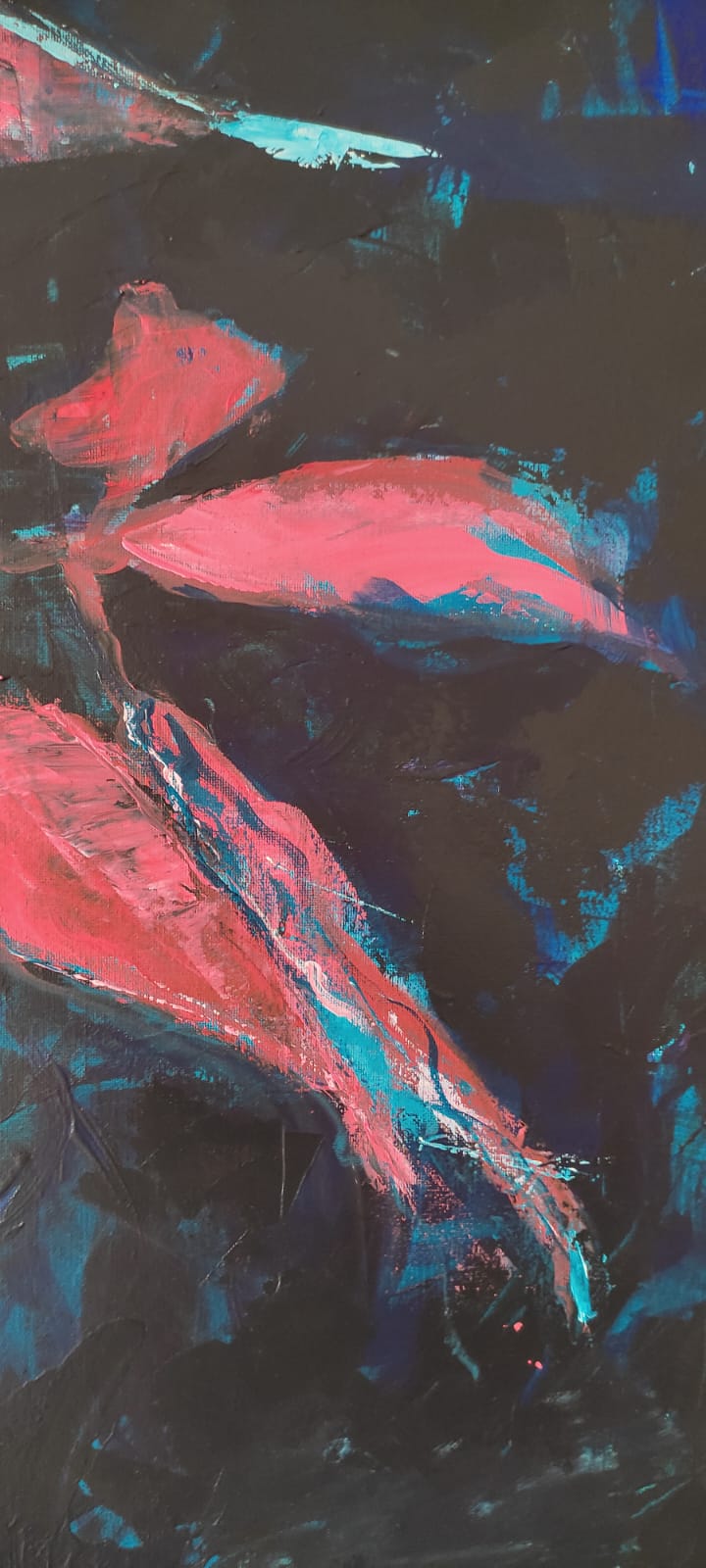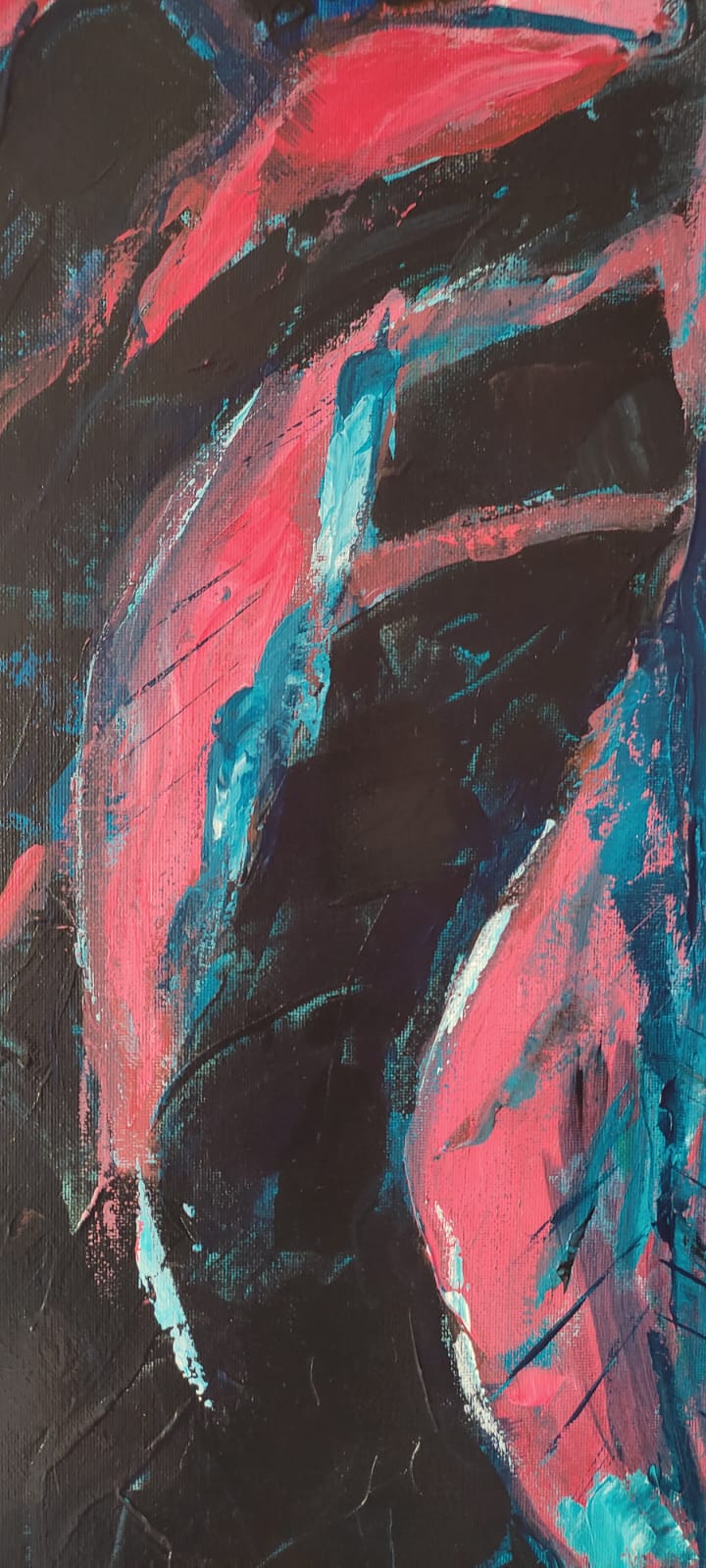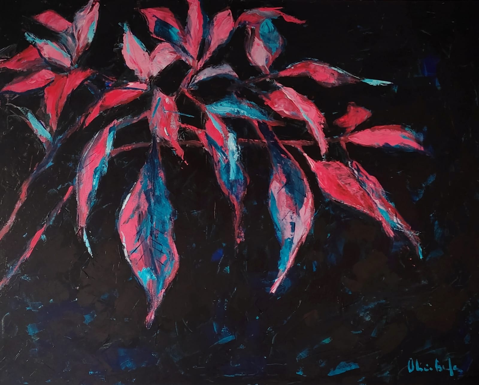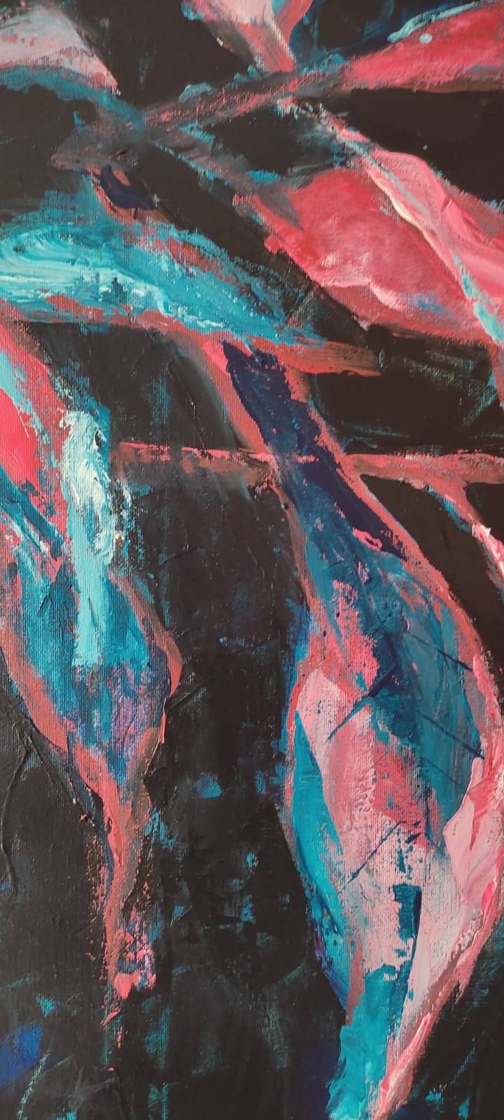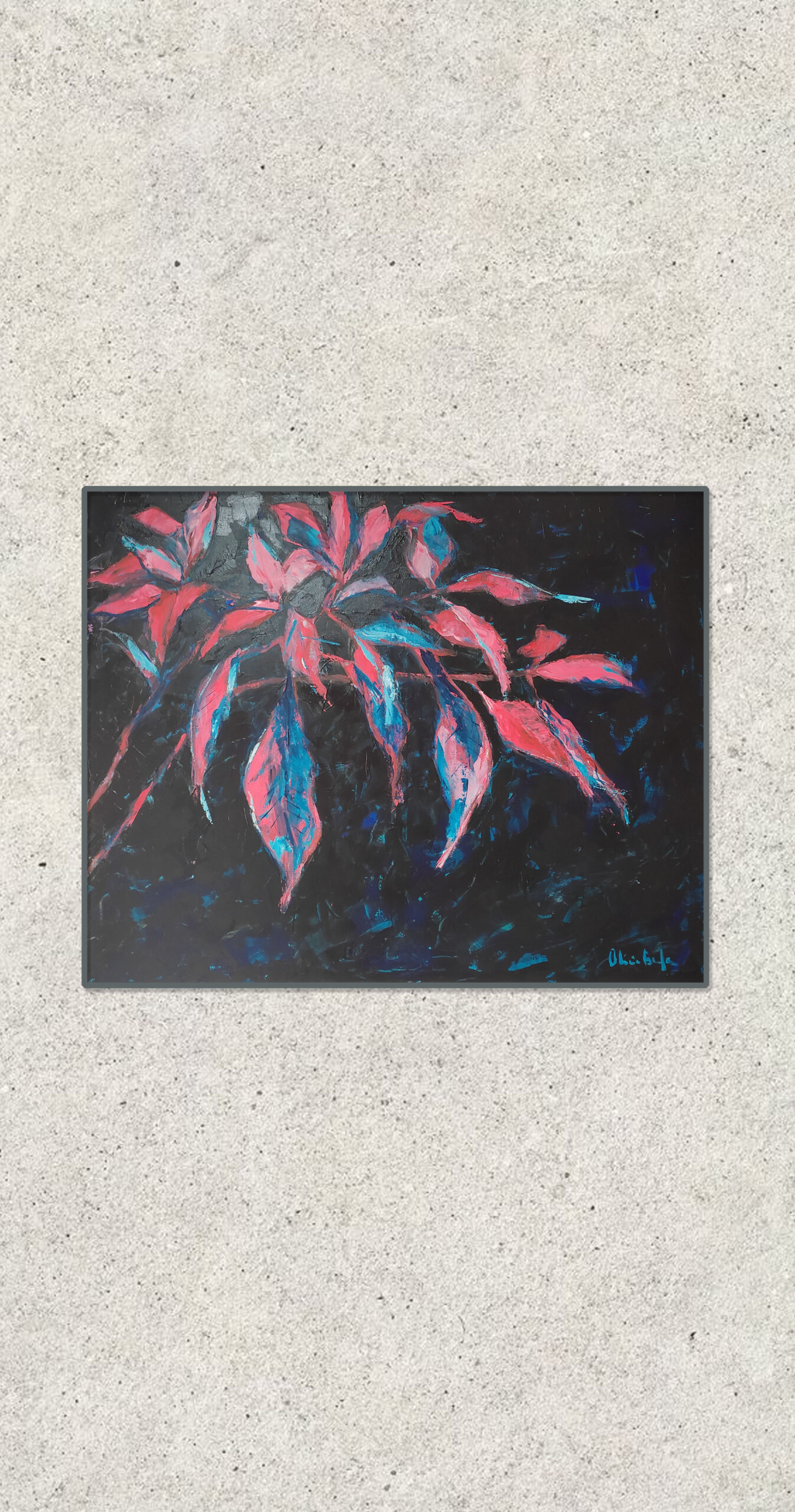 Esta obra nace de mi deseo de capturar la esencia de la naturaleza a través de una visión imaginativa y llena de energía. Los tonos rosas y azules que componen la planta se entrelazan con una intensidad vibrante, mientras que el fondo casi negro la rodea, creando un contraste fascinante. La oscuridad del fondo destaca la luz de la planta, como si emergiera con fuerza, como una luz en la oscuridad.