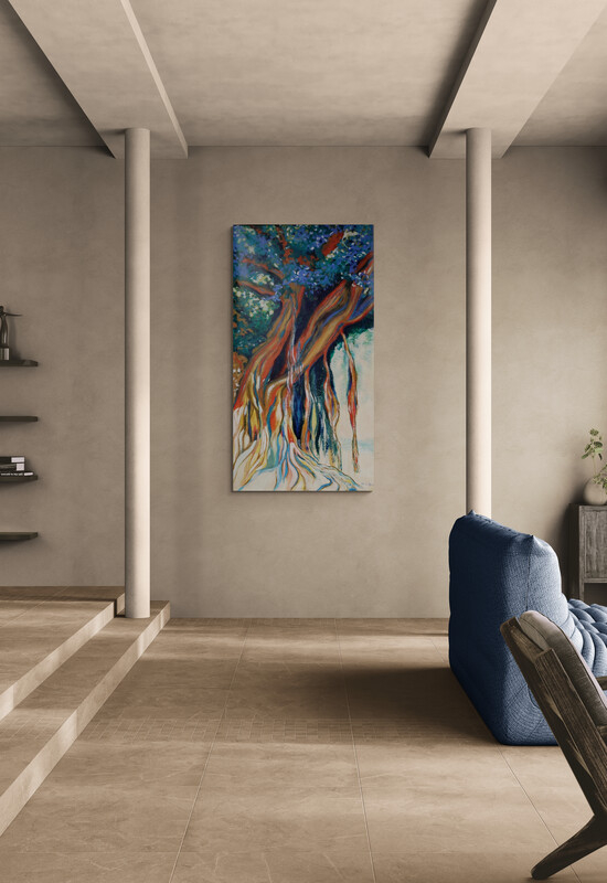En la ilustración se aprecian un ejemplar de los del Parque de Canalejas. La exageración de saturación de los colores vivos y cálidos en contraste con los azules y verdes oscuros nos muestran el especial filtro de luz que ofrece esta variedad, otorgando sombrajes de postín, densos. Y cómo la increíble geometría de sus troncos, raíces sobre la tierra, muestra en sus cambiantes superficies los reflejos de los pocos rayos que reciben. Una textura maravillosa y de fantasía.