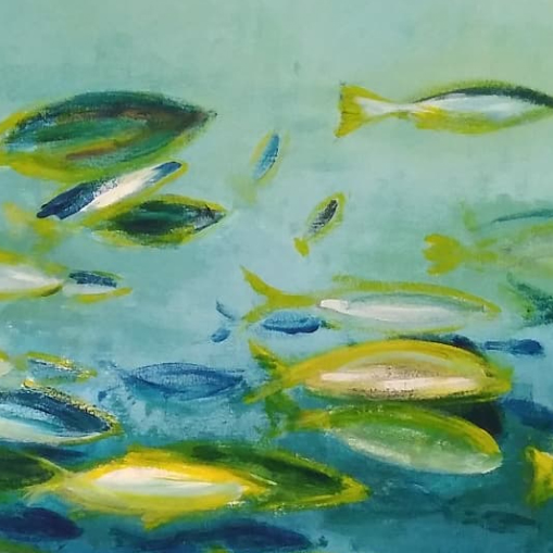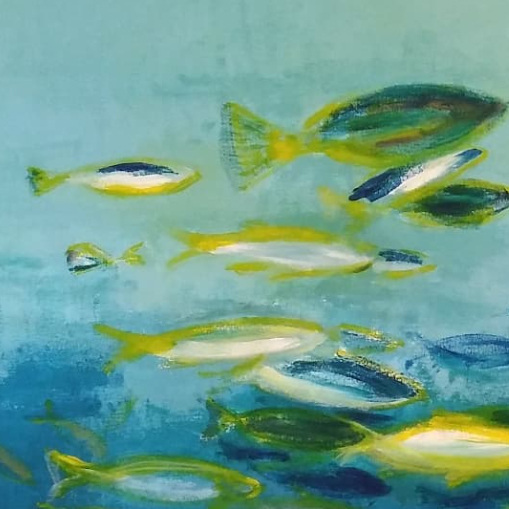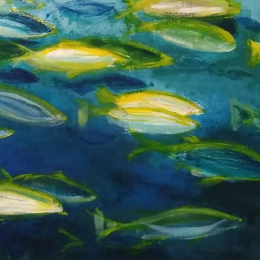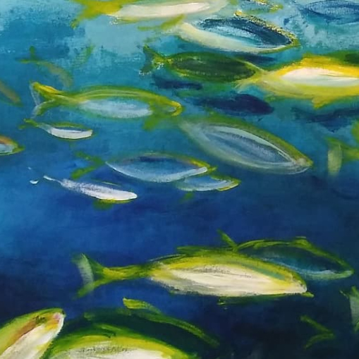 Inspirado en una fotografía capturada por buceadores en aguas cristalinas del Mediterráneo, este cuadro representa un banco de peces tipo salpas desplazándose en formación, como una coreografía natural bajo el mar. La escena ha sido reinterpretada exagerando la riqueza cromática del entorno submarino.
